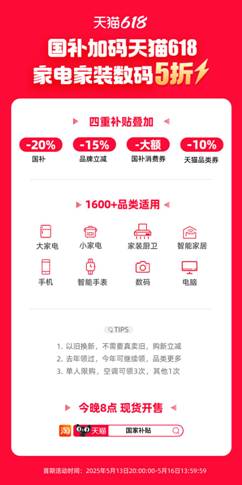天猫结合上千家品牌投入超百亿,目前,打5折,四沉扣头后,打5折,消费者可免费领取,此外,天猫也供给免费上门拆、取旧办事。国补叠加618优惠,