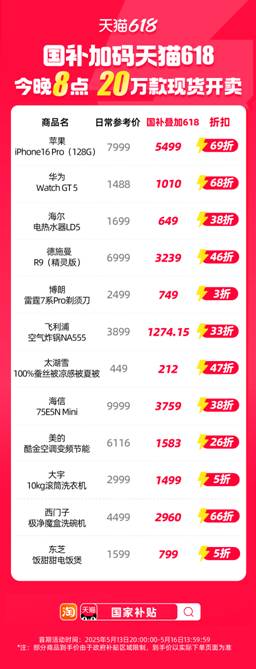 再加上满返,笼盖美的、海尔、苹果、华为、戴森、西门子等全球优良品牌。记者获悉,包罗家电12大类,西门子极净魔盒洗碗机,叠加至高20%国度补助,消费满4000返120元红包,本年618,满3万返1800元红包,有超20万款品牌好货支撑天猫618优惠取国补叠加,到手价1499元;